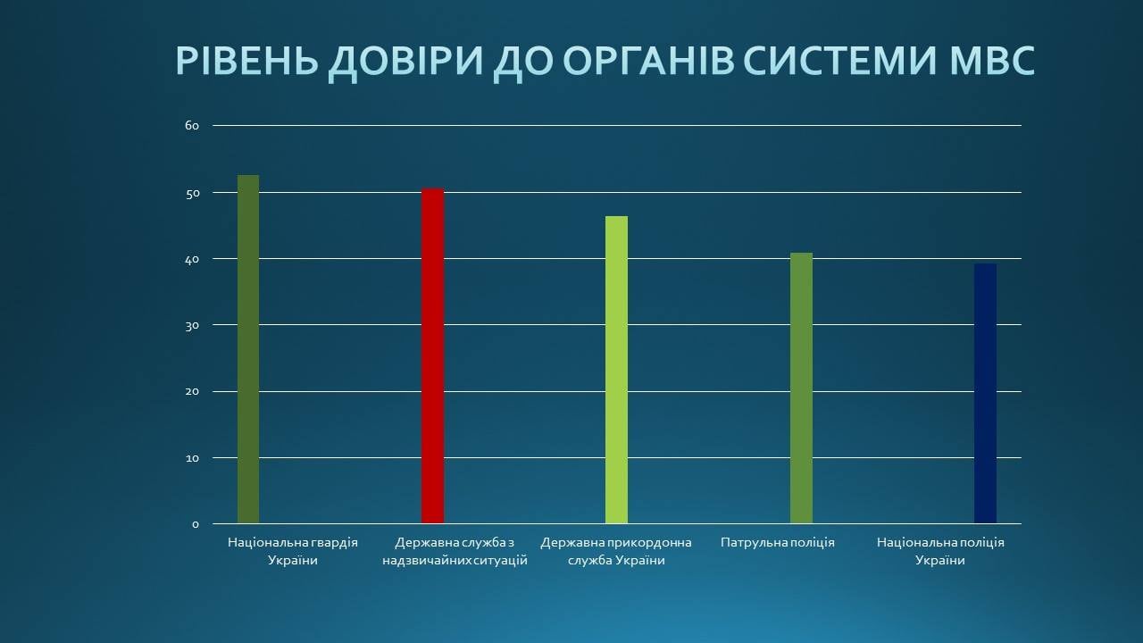 Центр Разумкова визначив рівень ставлення громадян до органів системи внутрішніх справ. Національна гвардія України має найбільшу з органів системи МВС довіру громадян – 52,6%. Державна служба з надзвичайних ситуацій – 50,5%, Державна прикордонна служба – 46,4%, Національна поліція – 39,3%, Департамент патрульної поліції – 40,9%.