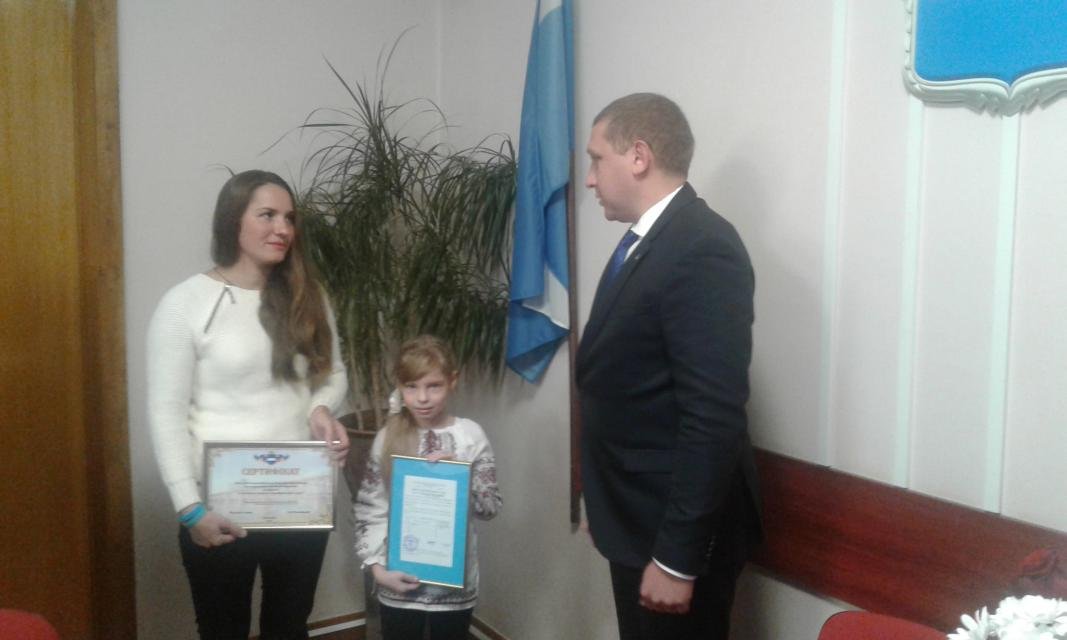 Дружині Лідії та доньці Ангеліні під оплески присутніх мер передав документи на квартиру. Коли родина покинула зал Віталій Малецький згадав, що не все передали родині.
