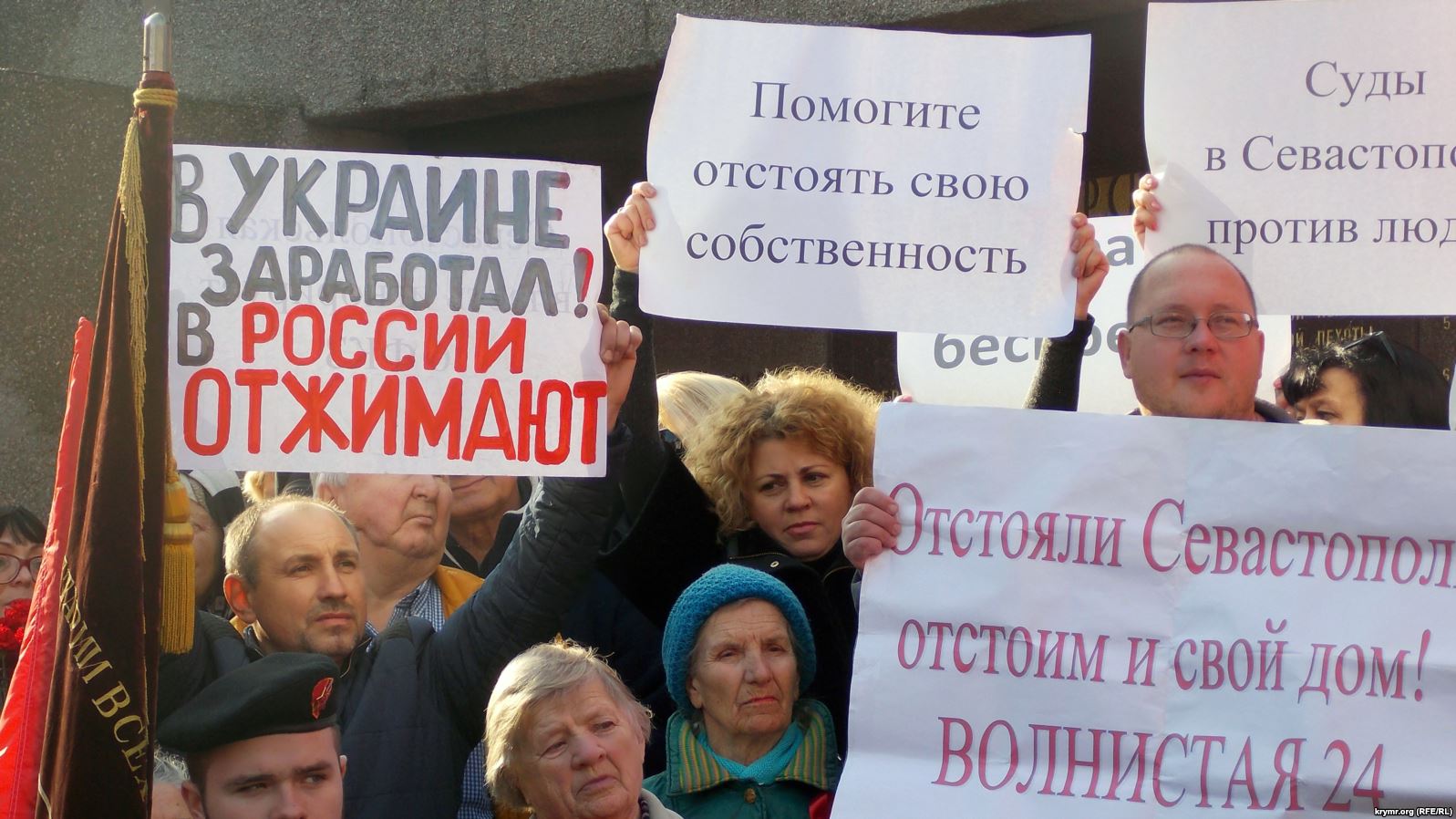 В руках митингующие держали плакаты с лозунгами «В Украине заработал! В России отжимают», «Судьи и чиновники с материка! Возвращайтесь по своим родным местам, хватит издеваться над севастопольским народом! Мы вас не звали! Хватит оккупации!».