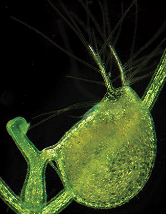 Utricularia gibba, или пузырчатка горбатая — хищное растение, которое использует для ловли мелких водных насекомых пузыри-ловушки. Когда жертва касается чувствительных волосков на пузыре, она за тысячную долю секунды засасывается внутрь вместе с водой, после чего ей остается только ждать смерти в пищеварительных соках растения.