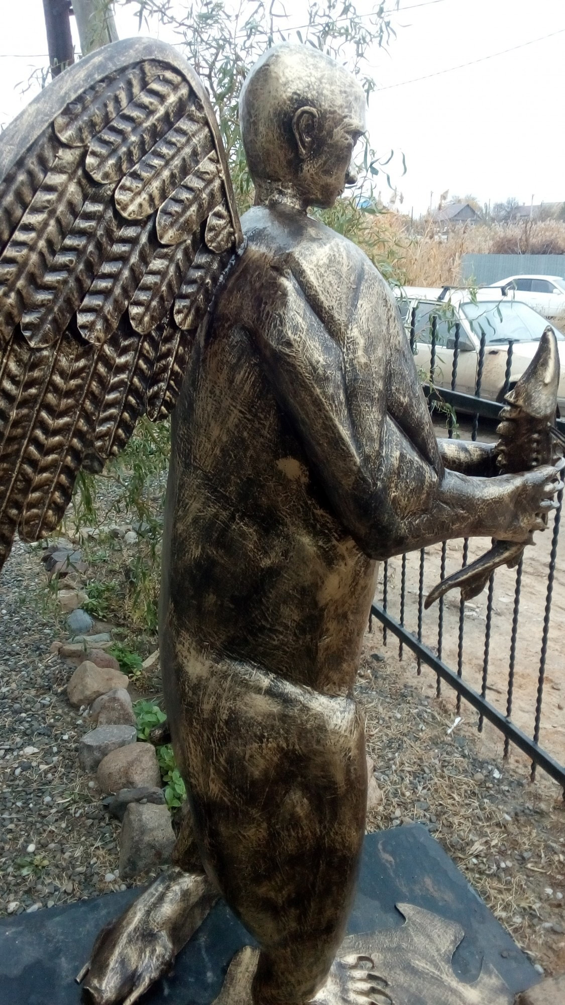 Житель Астрахани Виктор Кропачев сделал кованую скульптуру, изображающую Владимира Путина с телом крылатого медведя и осётром в руках. Она называется «Ум, сила и душа».