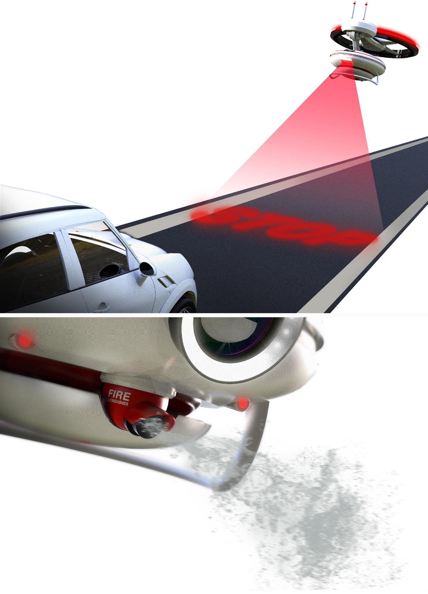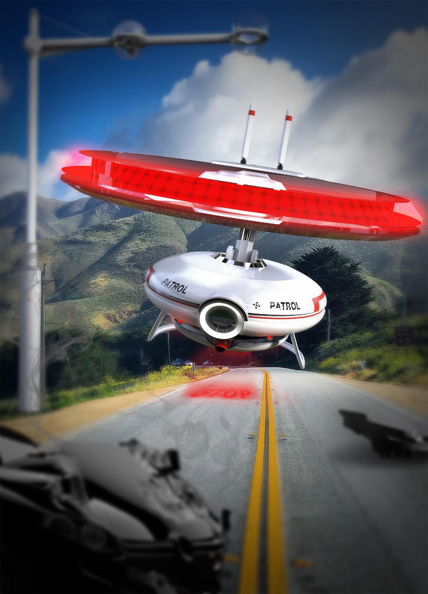 Дорожный патрульный дрон в неактивном состоянии пристыкован к специальной контрольной башне, установленной над дорогой. В этом режиме беспилотник следит за ситуацией на дороге и находит автомобили с определенными проблемами, например, находящиеся в розыске или просто неисправные. Когда в зоне видимости дрона случается авария, он сразу начинает передавать данные в центр управления дорожным движением и отстыковывается от башни. Информация об аварии не перестает передаваться до тех пор, пока на место не прибудут соответствующие службы.