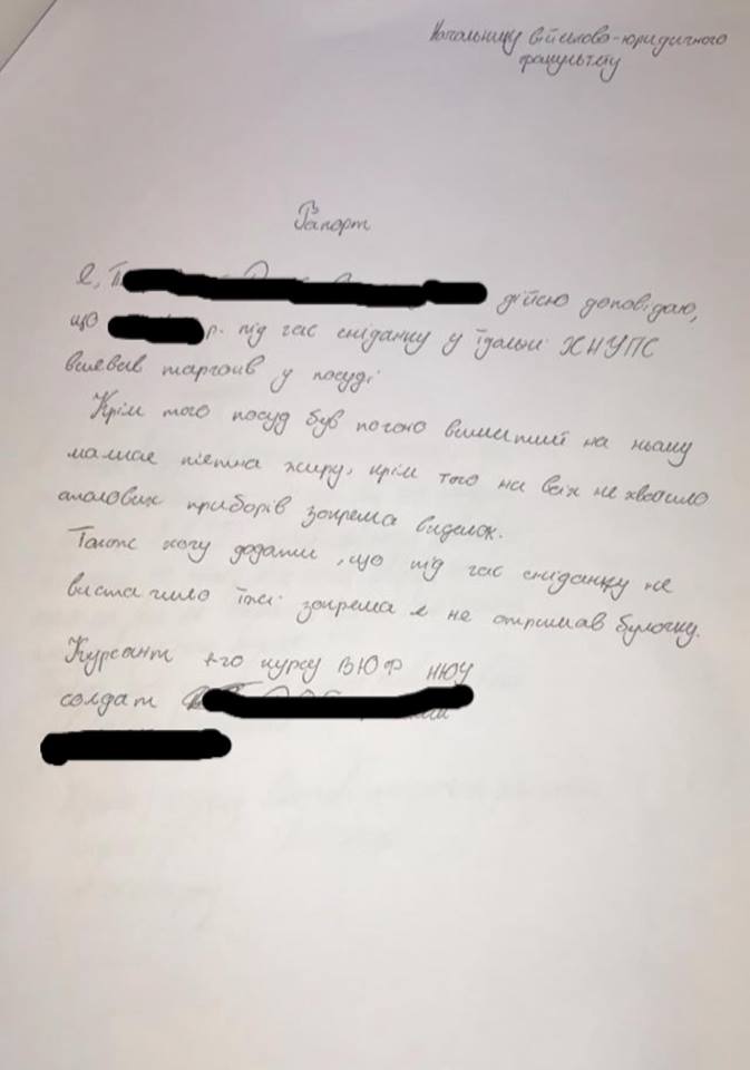 ( фото вчорашнього затримання керівника ХНІПС, який підозрюється у розкраданні, фото з їдальні інституту, рапорт про протидію з боку керівництва інституту при проведенні обшуку їдальні та один із 17 рапортів курсантів про знайдених тарганів і хробаків)