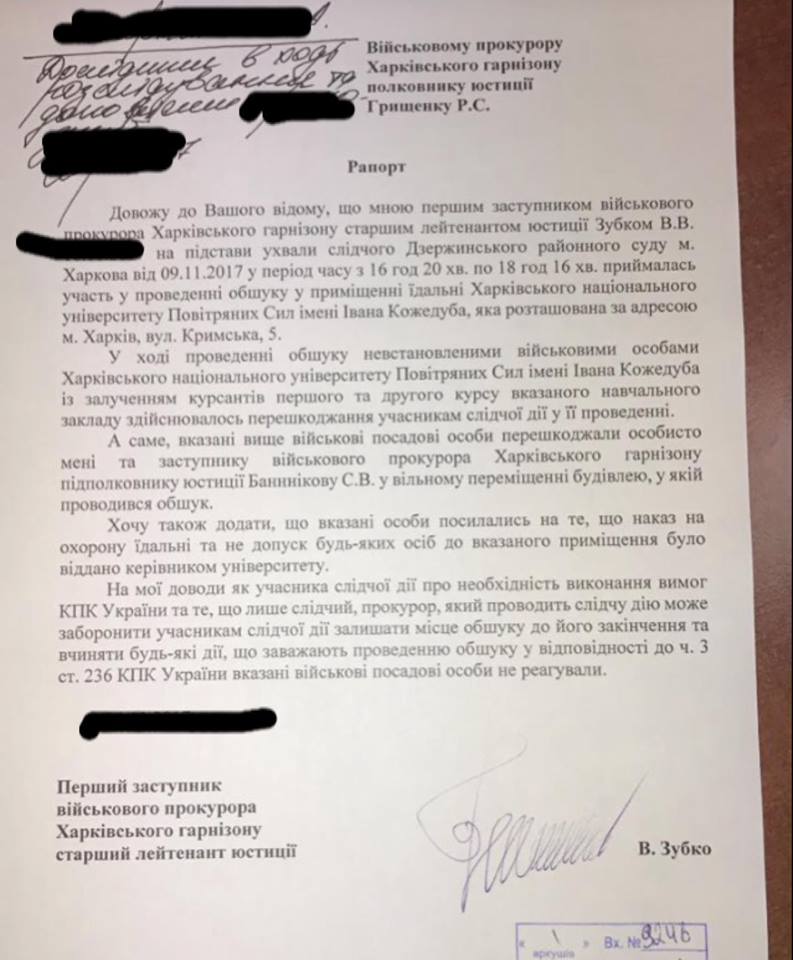 Харківського гарнізону, у зв'язку із розслідуванням розкрадань в Харківському Національному інституті Повітряних сил, йшли не на склади боєприпасів ( куди вже є заборона заходити з ГШ МОУ) - а в курсантську їдальню!