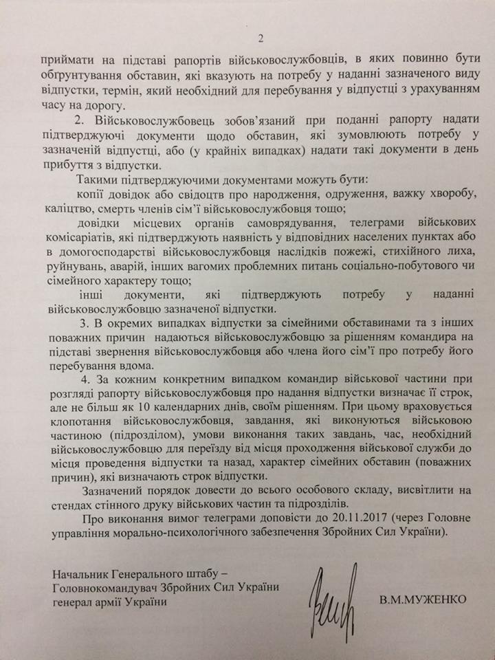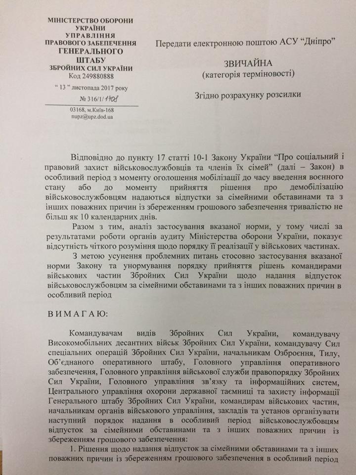 Начальник Генерального штабу - Головнокомандувач ЗСУ письмовим рішенням вимагає від командирів усіх рівнів дотримання порядку надання відпусток за сімейними обставинами