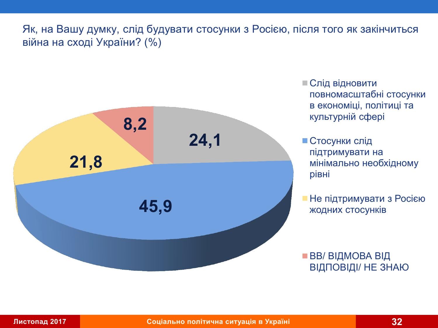 Почти четверть граждан Украины за возобновление полномасштабных отношений с Россией 23 ноября 2017 06:58 Об этом говорят данные опроса SOCIS, КМИС, "Рейтинг" и Центра Разумкова. Опрос проводился в период с 28 октября по 14 ноября по всей территории Украины, за исключением ОРДЛО и оккупированного Крыма.