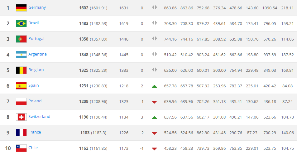 Тем временем в первой пятерке - без изменений: первое место занимает Германия, второе - Бразилия, третье - Португалия, на четвертой и пятой позициях расположились Аргентина и Бельгия соответственно.