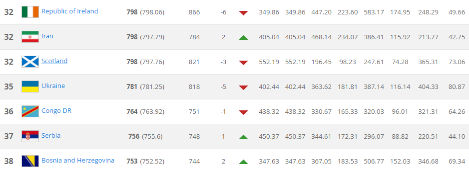 Ближайшие соседи Украины в текущем рейтинге - Шотландия (32-я позиция) и Демократическая Республика Конго (36-я).