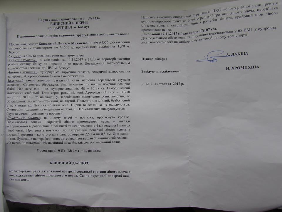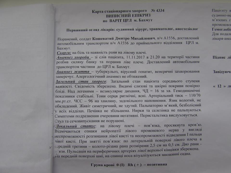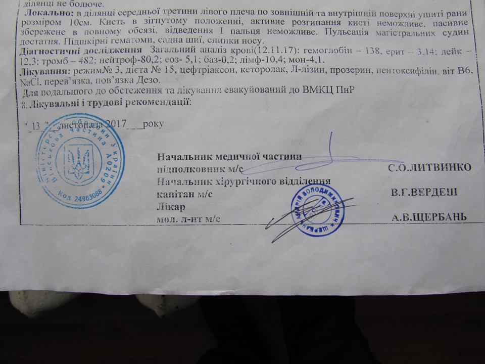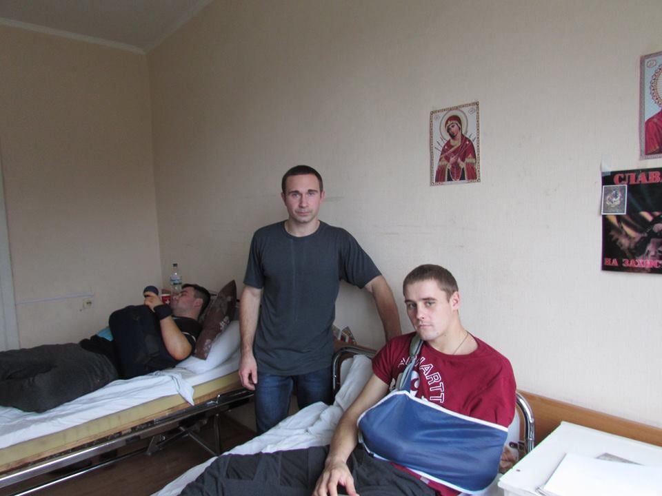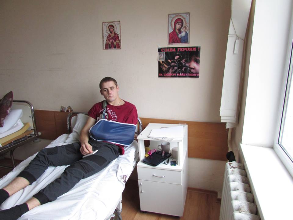 Общались с Дмитрием Кошеватым - участником АТО. Парень совсем молодой, 22 года. Он ранен. Кисть левой руки не двигается. У Димы колото-резанная рана, задет нерв. Очень большая вероятность того, что парнишка останется инвалидом...