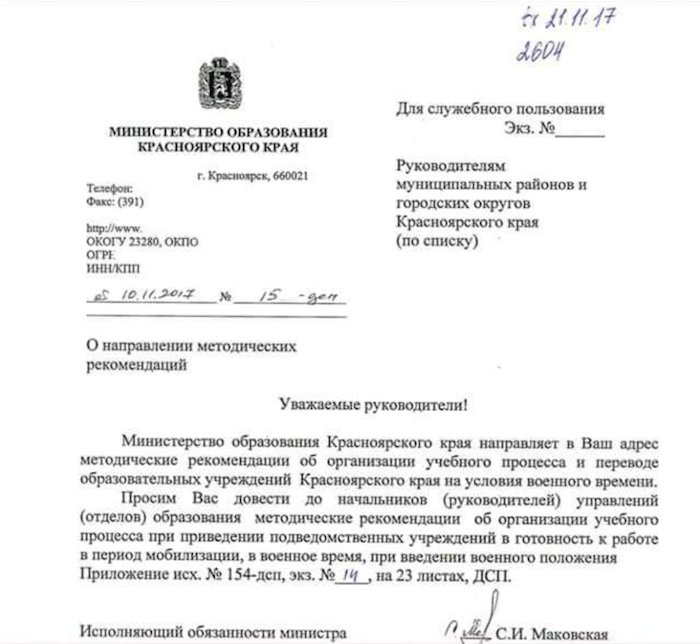 Министерство образования Красноярского края рекомендовало региональным образовательным учреждениям перейти на условия военного времени. Фотографию документа разместил в своем Twitter блогер Рустем Адагамов.