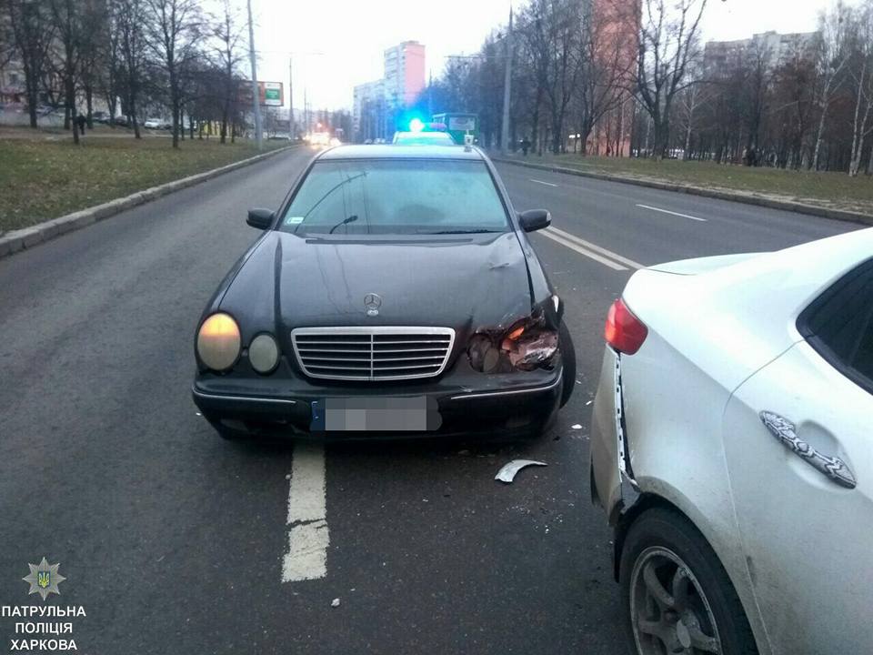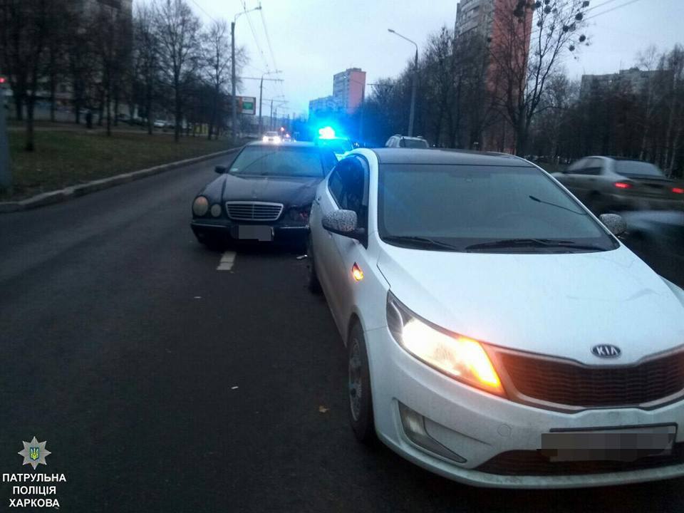 В Харькове на ул. Ахсарова произошло ДТП с участием "Мерседеса" и "Киа". Водитель "корейца" госпитализирован, "немец" сгорел.
