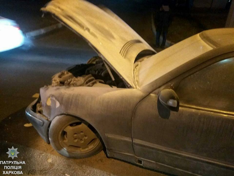 Також, під час охорони місця пригоди зайнялася автівка Mercedes. За допомогою вогнегасника патрульні загасили займання та викликали на місце події співробітників служби ДСНС.