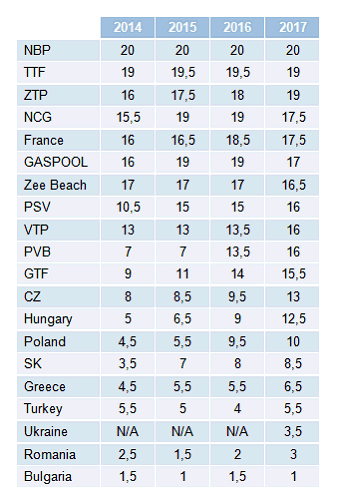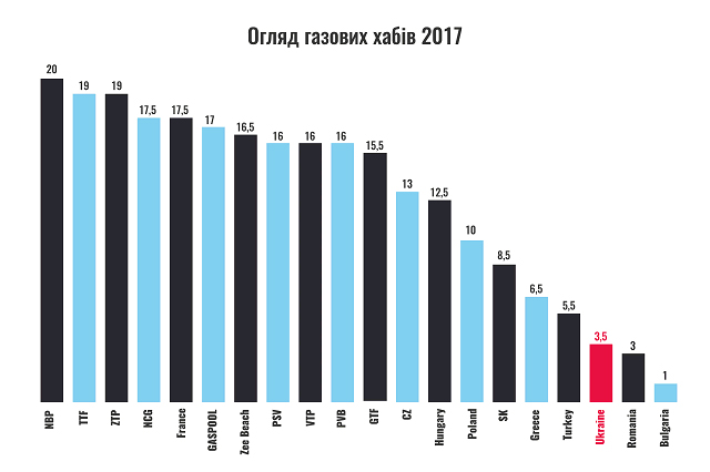 В рейтинге ассоциации Украина получила 3,5 балла и уступила таким хабам как NBP, TTF, NCG, но опередила Болгарию и Румынию.