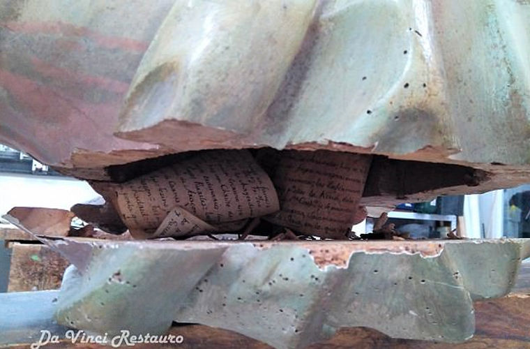 Статуя была повреждена, поэтому в ней открылось небольшое отверстие, объект пришлось демонтировать. Именно тогда реставраторы с удивлением осознали, что внутри что-то хранится.