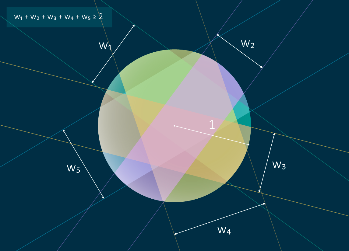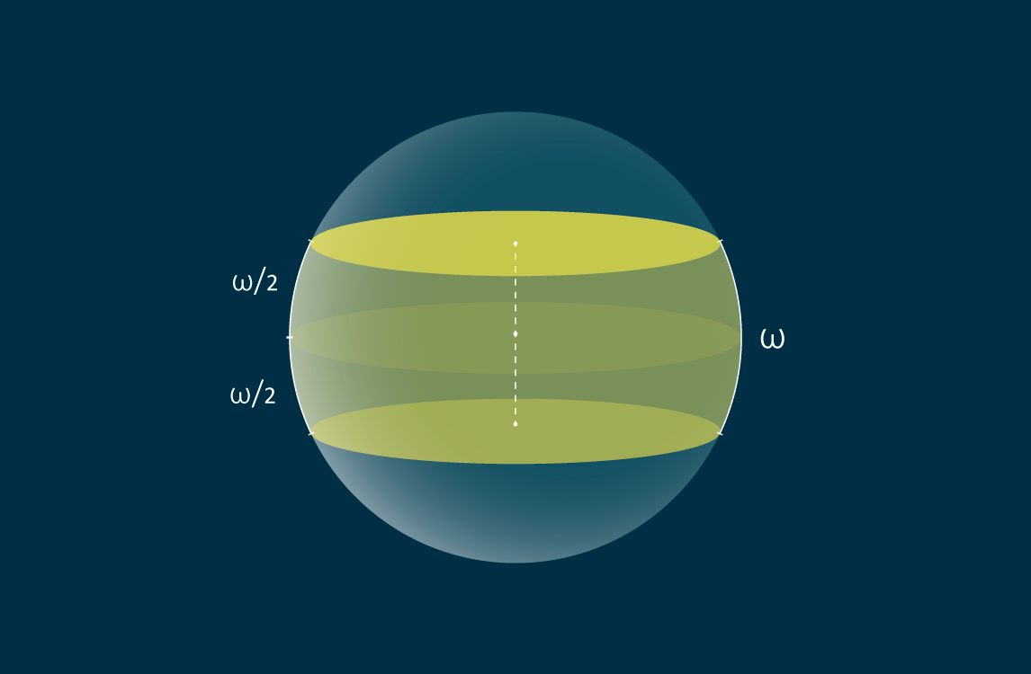 Задача, над которой работали авторы публикации, принципиально отличается от предыдущих: в ней требуется исследовать покрытие сферы с единичным радиусом особым образом построенными зонами. А именно: каждая зона поставлена в соответствие определенной трехмерной полоске-дощечке (всему тому, что заключено между двумя параллельными плоскостями, расположенными симметрично относительно центра сферы) и является ее пересечением со сферой. Можно ввести и другое определение, уже не ассоциируя зоны с полосками: зоной ширины ω на поверхности сферы с единичным радиусом называется множество точек, которые находятся на расстоянии не более ω/2 от большой окружности (экватора) в геодезической метрике (т. е. расстояние между двумя точками равно длине наименьшей дуги, их соединяющей). Математикам необходимо было найти минимальную суммарную ширину нескольких таких зон, покрывающих единичную сферу. Основное отличие задачи от предыдущих в измерении ширины: в случае обычных полосок ширина — это евклидово расстояние между параллельными прямыми или параллельными плоскостями, а этом случае — это длина дуги.