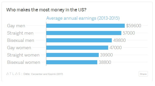 Из отчета следует, что средняя зарплата гомосексульных мужчин составляет $59 600, а гетеросексуалов –$57 000. Интересно, что такая же тенденция прослеживается и у женщин. Так, лесбиянки в среднем зарабатывают $47 000, а гетеросексуальные женщины — $39 900.