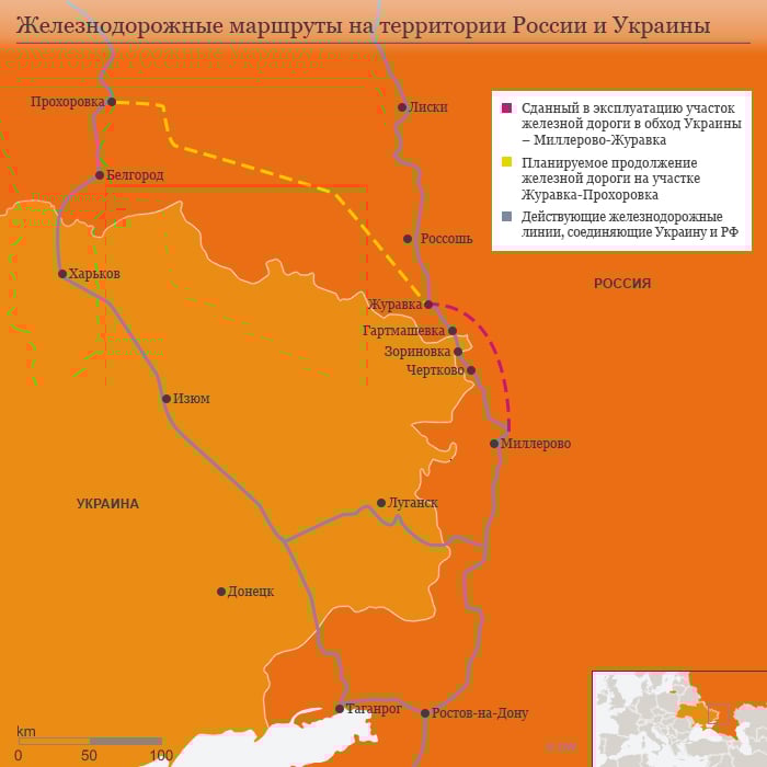РЖД планирует продолжение строительства дороги от станции Журавка до Прохоровки. А к 2025 году будет сдана скоростная железнодорожная магистраль вдоль восточной границы Украины, которая соединит Центральную часть РФ с Черноморским побережьем (направление Воронеж-Лиски-Ростов-на-Дону). Охрименко предупреждает, что "когда Россия выстроит свою инфраструктуру в этом регионе и прекратит использовать Украину как транзитную страну, украинцы могут потерять до 1,6 млрд долларов - столько они зарабатывали в 2011-2012 годах на железнодорожном транзите в Европу, когда отношения с РФ не были такими, как сейчас". Эту же цифру возможных потерь Украины ранее называли СМИ, ссылаясь на слова Евгения Червоненко - экс-министра транспорта и связи при Викторе Ющенко.