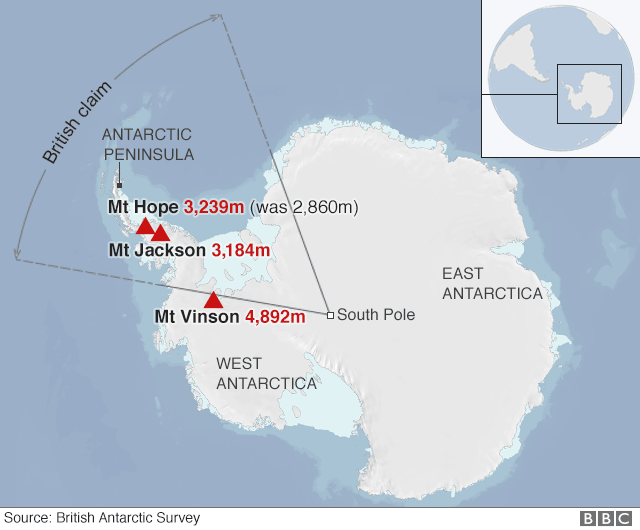 Самыми высокими точками Антарктиды по-прежнему остаются пики массива Вилсон, достигающие высоты в 4892 м. На территории самой Великобритании самая высокая гора – Бен-Невис в Шотландии (1342 м). Британские арктические территории не входят в состав Соединенного Королевства и относятся к Британским заморским территориям; по Договору об Антарктиде 1961 года Великобритания, как страна, озвучившая территориальные претензии на часть Антарктиды до подписания договора, сохраняет «основы на претензии», но Антарктиды не попадает под суверенитет ни одного государства мира.