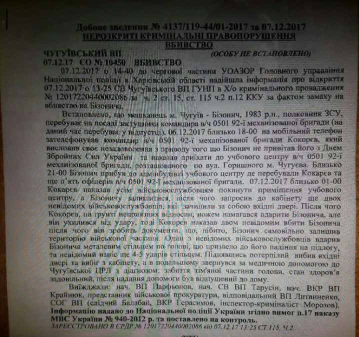 Военная прокуратура возбудила дело по статье 115 покушение на убийство по заявлению Дмитрия Бизонича заместителя командира бригады по тыловой части 92-й механизированной бригады. Бизонич заявил, что убить его пытался командир бригады Владимир Кокорев.