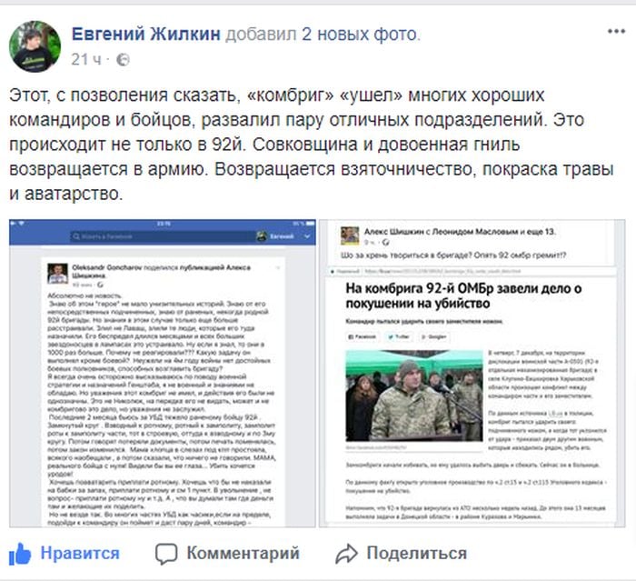 Но вернемся к нашему инциденту 6-7 декабря. Как бы там не было, расследовать его должна военная прокуратура, а мы будем следить за развитием ситуации. А тем временем 12 декабря стало известно, что командира 92-й бригады Владимира Кокорева отстранили от обязанностей после возбуждения дела по статье 115 "Покушение на убийство" своего заместителя Дмитрия Бизонича.