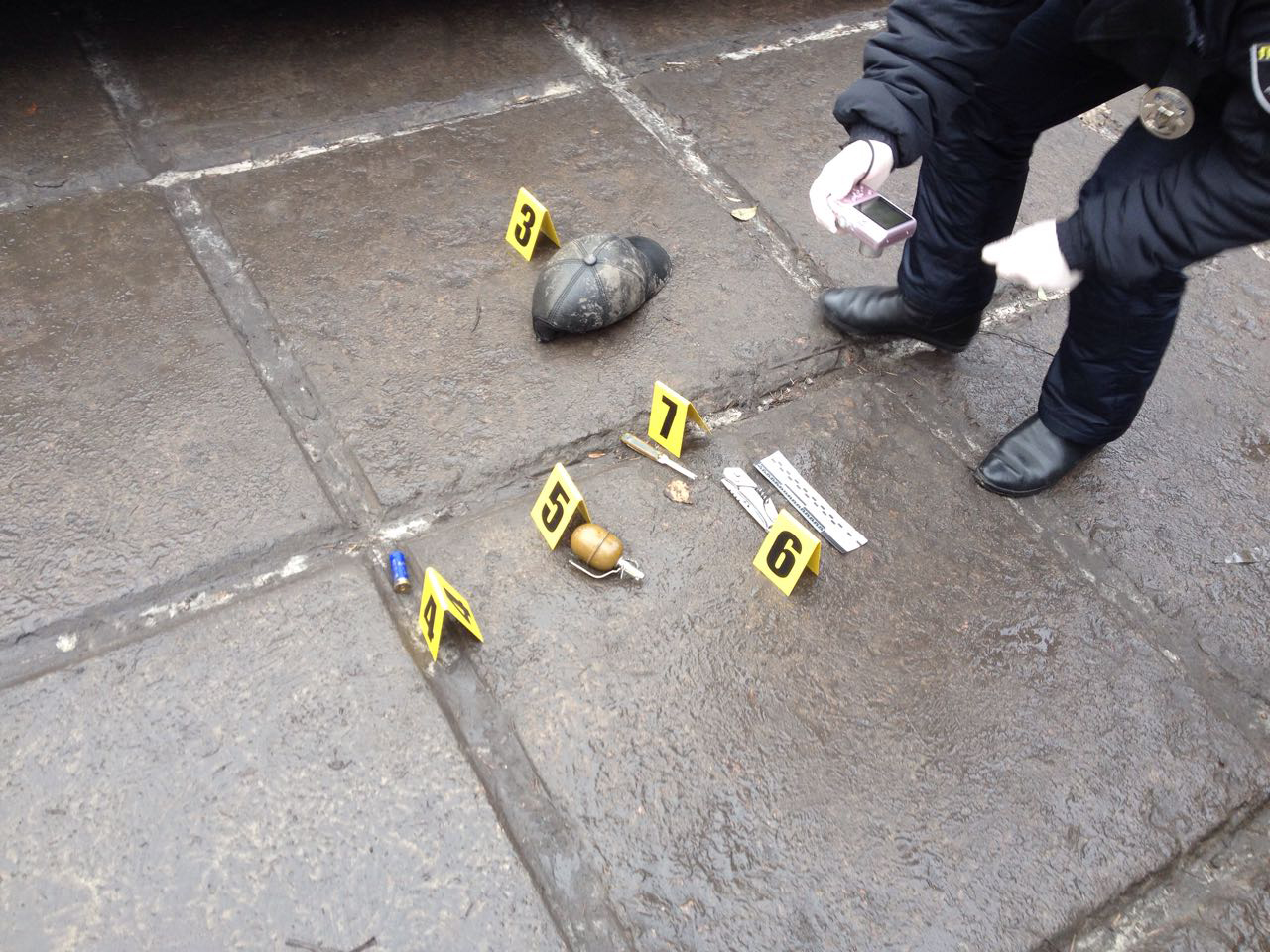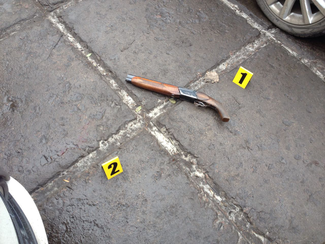 У ході огляду місця події у нападника вилучено обріз мисливської рушниці, гранату із запалом, розкладний ніж та патрон.