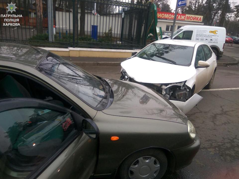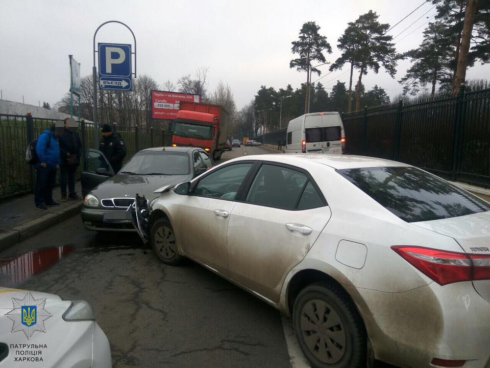 По данным патрульной полиции Харькова, водитель автомобиля Toyota Corolla перед поворотом налево в парк Горького, не предоставил преимущества в движении и совершил столкновение с автомобилями Ford Transit и Daewoo Lanos, которые двигались во встречном направлении прямо.