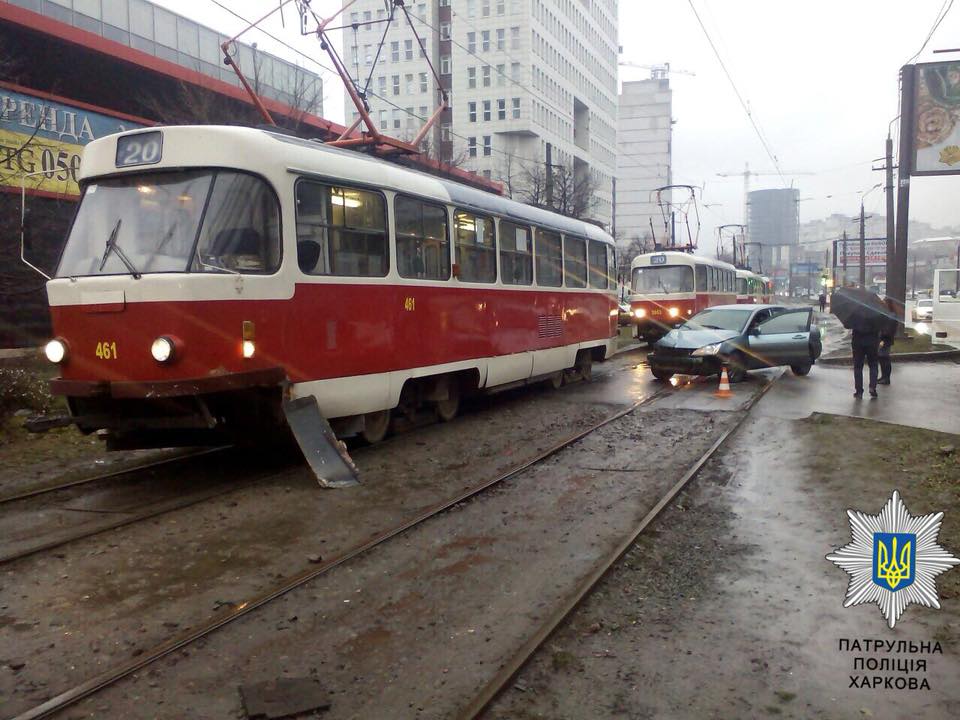 По данным патрульной полиции Харькова, "водитель автомобиля Митсубиси Лансер поворачивая направо не предоставил преимущества в движении трамваю, в результате чего совершил с ним столкновение. Пострадавших, к счастью, нет".