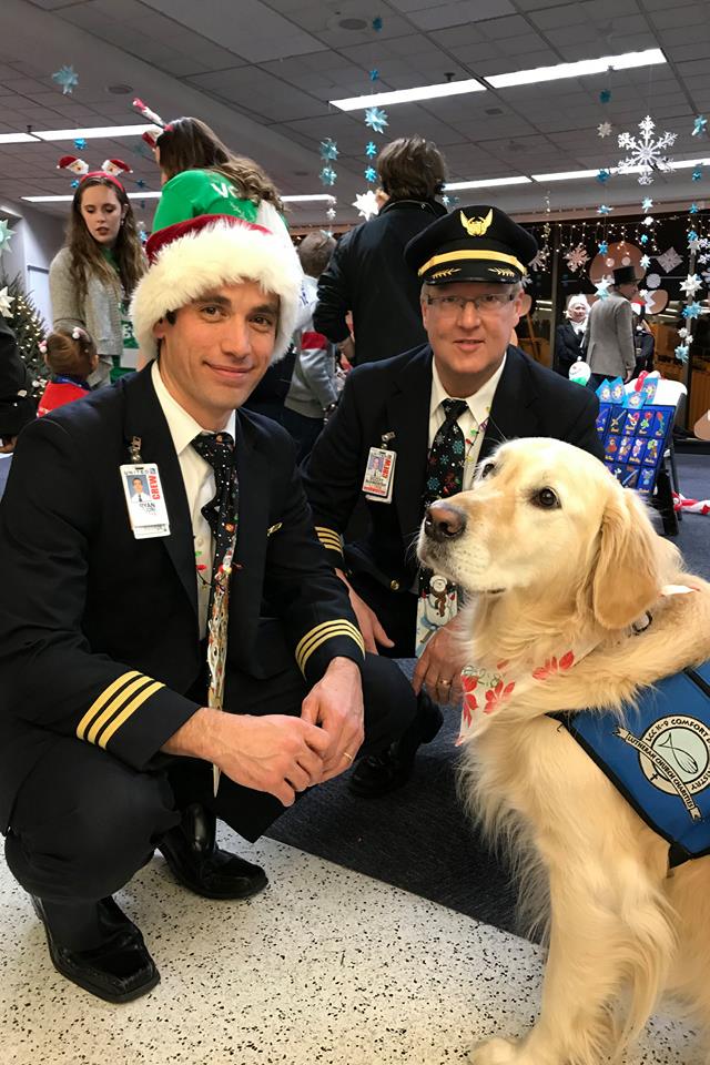 Специально обученные собаки комфорта в местных аэропортах помогали детям справиться с волнением перед полетом.