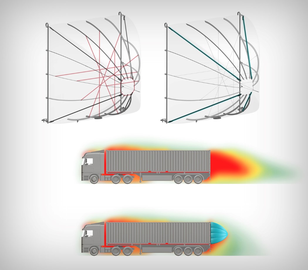 Концептуальная конструкция называется Trucktail и, в отличие от других решений для снижения аэродинамического сопротивления, является временным. Хвост, сделанный из ПВХ-ткани, можно легко и быстро установить, для этого его нужно просто привязать к задней части грузовика. Он также легко сдувается и сворачивается до небольших размеров.