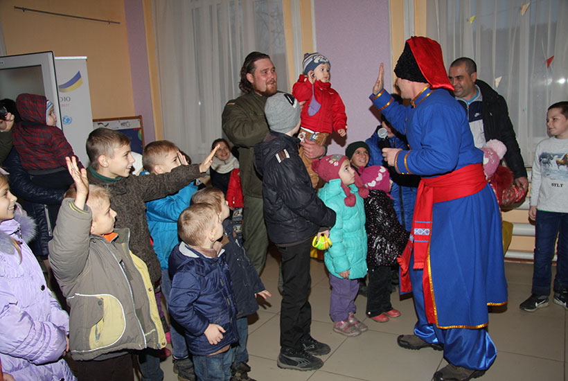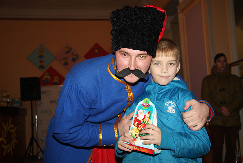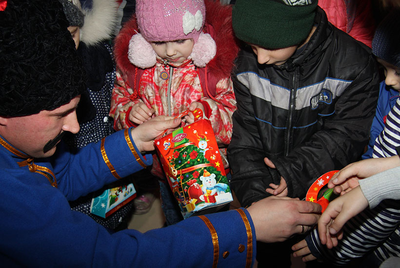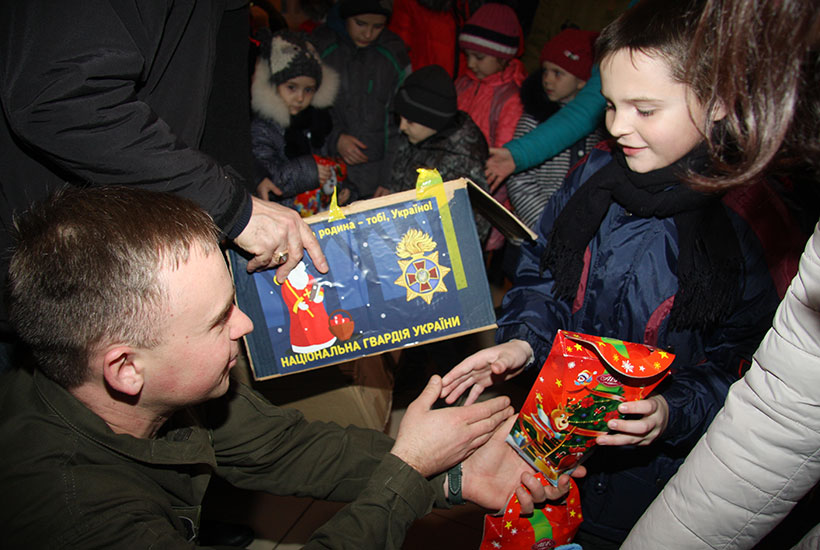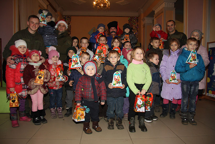 За вже встановленою під час акції традицією, солодкі подарунки роздавав Святий Миколай в образі козака. Цього разу, щоправда, не обійшлося без невеличкого курйозу, адже яким би спланованим не був захід, все одно можуть втрутитися непередбачувані обставини. Іграшок і одягу військові гості привезли з собою достатньо, а от подарункових наборів солодощів вистачило не всім. Справа в тім, що громадська організація «Право на життя» надала гвардійцям список з певною кількістю дітей-переселенців і відповідно до нього було скомплектовано подарункові набори. Їх із собою взяли навіть із запасом. Але малі жителі Слов’янська, які прийшли до Центру культури займатися в гуртках, почувши голос «Миколая», теж завітали на свято. Ось тоді і виявилася «недостача». Миттю військовий «бусик» повернувся до частини, де зберігається вся зібрана допомога, і вже за деякий час без смачного подарунку не залишилося жодної дитини! З щасливими посмішками на обличчях і з пакуночками в руках всі вони виходили зі святкової зали.