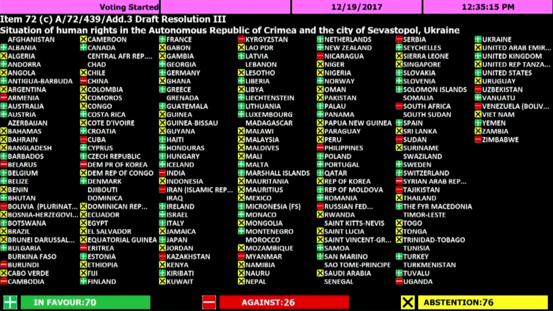 За резолюцию "Ситуация с правами человека в Автономной Республике Крым и г. Севастополь" проголосовало 70 стран, против - 26 стран, еще 76 стран - "воздержались", - передает Европейская правда.