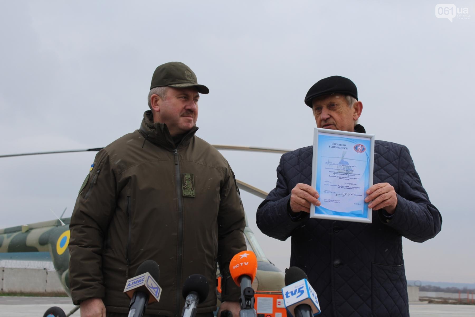 На передачу техніки прибули командувач Національної гвардії України генерал-полковник Юрій Аллеров і президент ПАТ «Мотор Січ» В'ячеслав Богуслаєв. Вони зустрілися з журналістами у льотно-випробувальному комплексі і провели перший випробувальний політ. Усі присутні мали можливість оглянути відремонтований Мі-2МСБ із запорізьким двигуном АІ-450.