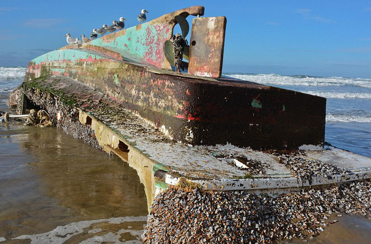 Рыболовное судно с японским названием было обнаружено на пляже Аркадия-Бич в штате Орегон. Корабль был не один. На нем гордо восседали чайки, привлеченные местной жизнью — ракушками, захватившими корабль во время его шестилетнего дрейфа в океане. Морские уточки расселились по всему судну — и внутри, и снаружи. Настоящее изобилие деликатесной продукции.