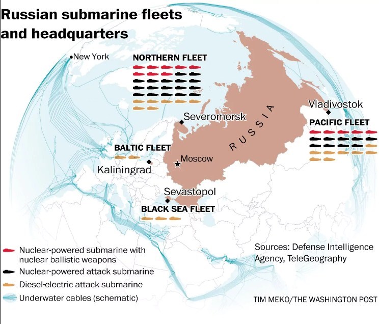 Россия может намеренно вывести из строя подводные кабели на дне Атлантического океана, обеспечивающие выход в интернет, и другие коммуникации, в Европе и Северной Америке.