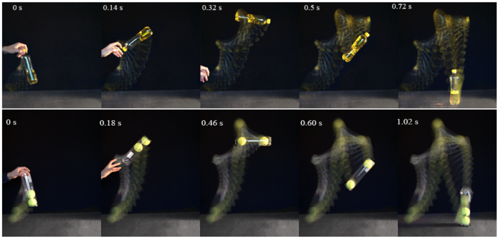 Последовательные кадры полета бутылки с жидкой водой (сверху) и цилиндра с двумя теннисными мячами (снизу), успешно приземлившихся на дно