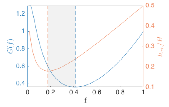 Первый из критериев — это величина максимального относительного увеличения момента инерции во время полета. Согласно использованной модели, эта величина принимает минимальное значение, оптимальное для выполнения трюка, если бутылка заполнена водой на 41 процент. Второй критерий — это положение центра масс бутылки относительно ее центра в момент приземления. Чем ниже он расположен, тем более устойчивой будет бутылка и тем ниже вероятность ее опрокидывания после приземления.