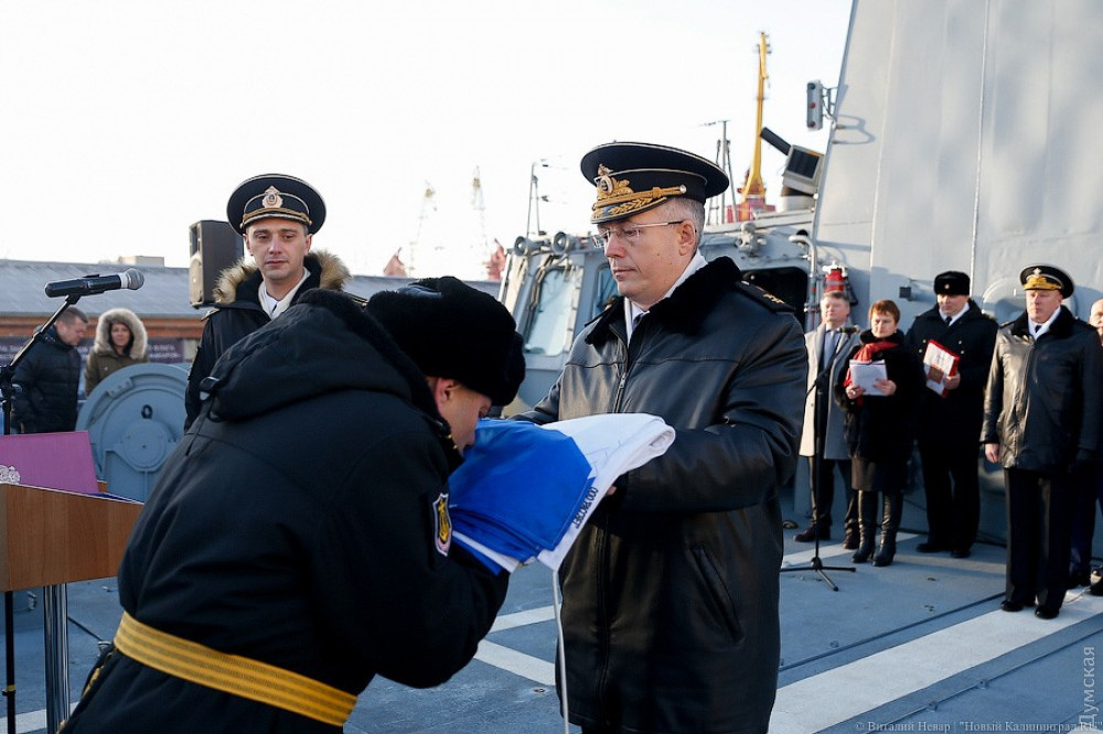 Он участвовал в церемонии поднятия флага на корабле, которая прошла вчера на судостроительном заводе «Янтарь» в Калининграде.