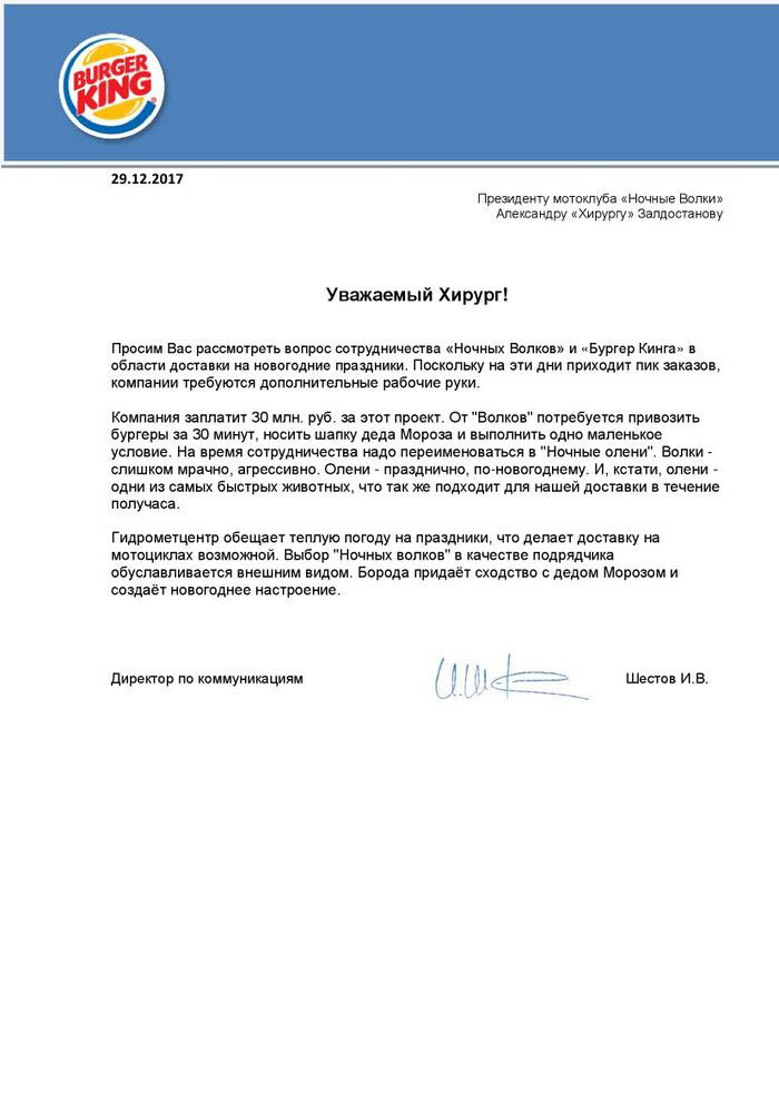 Сеть фастфуда Burger King предложила главе мотоклуба «Ночные волки» Александру Залдостанову (Хирургу) через соцсети Facebook и «ВКонтакте» сотрудничество в доставке еды на новогодние праздники. Однако позже сообщения с предложением исчезли.