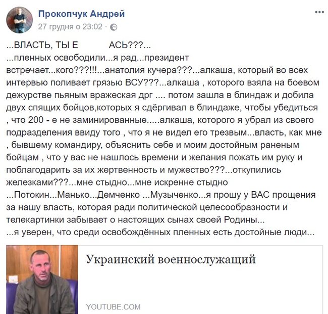 "Пленных освободили...я рад...президент встречает...кого???!!!...анатолия кучера???...алкаша, который во всех интервью поливает грязью ВСУ???...алкаша , которого взяла на боевом дежурстве пьяным вражеская дрг .... потом зашла в блиндаж и добила двух спящих бойцов,которых я сдёргивал в блиндаже, чтобы убедиться , что 200 - е не заминированные.....алкаша, которого я убрал из своего подразделения ввиду того , что я не видел его трезвым...власть, как мне , бывшему командиру, объяснить себе и моим достойным раненым бойцам , что у вас не нашлось времени и желания пожать им руку и поблагодарить за их жертвенность и мужество???...откупились железками???...мне стыдно...мне искренне стыдно", - пишет Прокопчук.