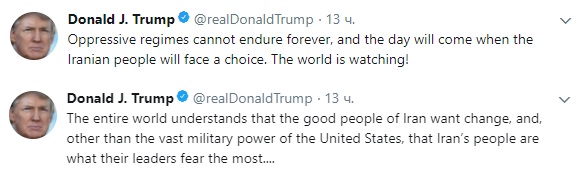 "Весь мир понимает, что хорошие люди в Иране хотят изменений, и, помимо вооруженной мощи США – люди Ирана это то, чего его руководители боятся больше всего", - написал он.