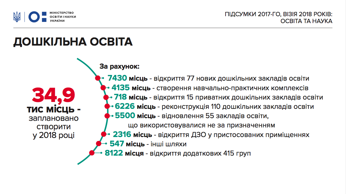 У 2018 році органи місцевого самоврядування планують створити 34,9тис місць у дошкільних навчальних закладах. Відповідні показники закладено в затвердженому Кабміном Плані подолання черги в дошкільні навчальні заклади до 2020 року.