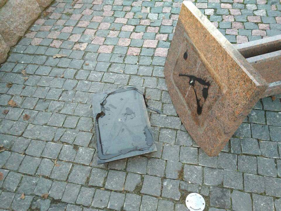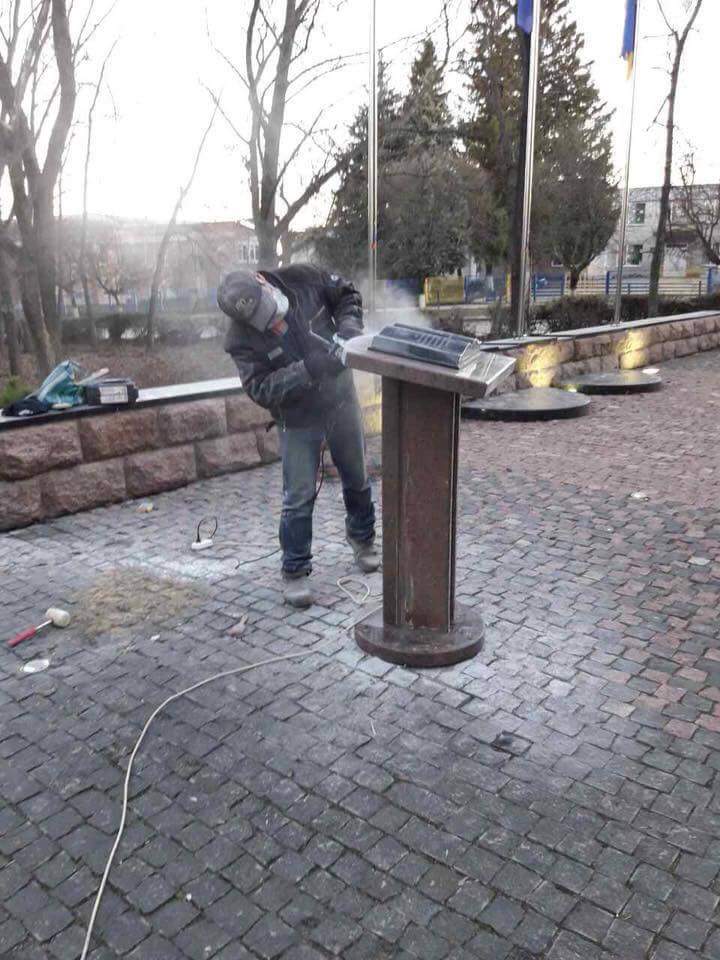 Около 00:30 злоумышленники повредили трибуну и гранитную книгу с надписью «Акт проголошення незалежності України». Полиция открыла уголовное производство, проводятся следственные действия, изучаются записи камер видеонаблюдения.