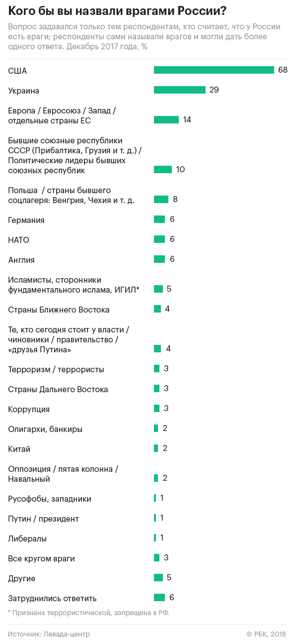 Левада-центр в начале декабря 2017 года провел опрос россиян (есть в распоряжении РБК) о наличии у страны врагов. 66% респондентов на вопрос, есть ли у сегодняшней России враги, ответили утвердительно, 21% отрицает их наличие. Доля тех, кто считает, что у России есть враги, оказалась минимальной с 2012 года — тогда об этом заявили 63% опрошенных.