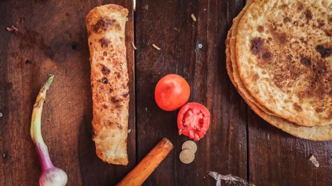 Хороший пример такой еды - то, что здесь называют "ролекс" (от слова roll, "заворачивать"): в чапати (нечто вроде тонкого лаваша) заворачивают смесь из жареного лука, помидоров и яиц. Ролексы продают повсюду.