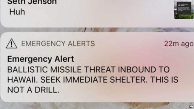 Жители Гавайев в субботу получили предупреждение о «ракетном нападении» на острова. Около 8 часов утра несколько десятков жителей штата разместили в соцсетях скриншоты сообщений, которые они получили на свои мобильные телефоны. «Угроза ракетного нападения на Гавайи. Немедленно найдите убежище. Это не учения», - гласил полученный текст.
