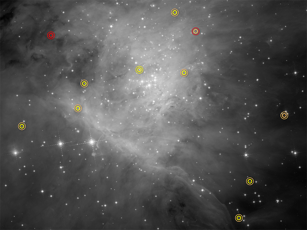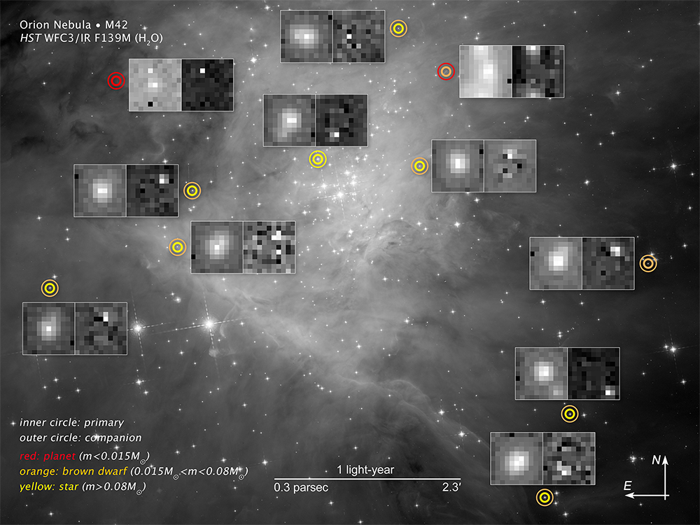 М42 или Большая туманность Ориона — ближайшая к Земле область образования звезд, расположенная в 1350 световых годах, что позволяет изучать процессы формирования и эволюции звезд и субзвездных объектов самых разных типов. Поскольку коричневые карлики холоднее звезд, то в их атмосфере может существовать водяной пар, который можно обнаружить при наблюдениях в ближнем инфракрасном диапазоне. Этим воспользовалась команда ученых во главе с Массимо Роберто (Massimo Robberto), которая при помощи «Хаббла» обнаружила в туманности 1200 красноватых объектов-кандидатов. Наиболее яркие объекты, имевшие водяной пар, были идентифицированы как красные карлики, более тусклые — как коричневые карлики и планеты. Остальные объекты не имели признаков наличия водяного пара и были классифицированы как звезды, свет от которых претерпел рассеяние на частицах пыли.