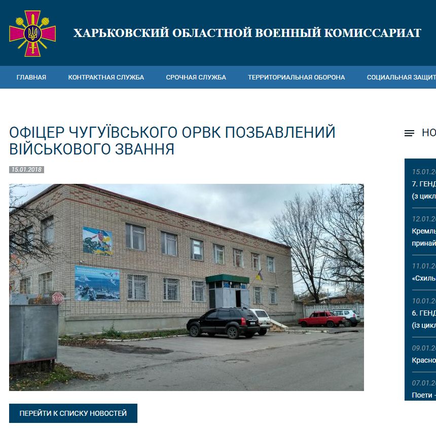 Сьогодні, 15 січня, на сайті ХОВК була оприлюднена інформація про те, що підозрюваний у хабарництві позбавлений військового звання: