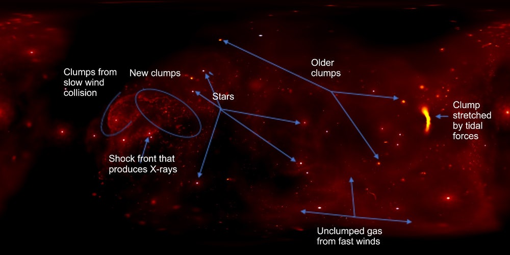 "Фигуранты" всего этого, звезды Вольфа-Райе, ведут очень активную, но очень короткую "жизнь". Это является следствием того, что такие звезды теряют свою материю феноменально быстрыми темпами, постоянно извергая ее в пространство в виде сильных звездных "ветров". Когда потоки этих ветров от разных звезд сталкиваются в космическом пространстве, возникают ударные волны, нагревающие космический газ до очень высоких температур, что заставляет этот газ интенсивно светиться в различных диапазонах, включая рентгеновский.