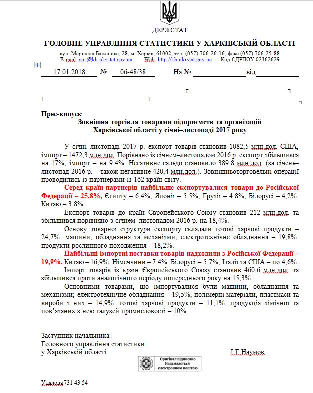 Серед країн-партнерів найбільше експортувалися товари до Російської Федерації – 25,8%, Єгипту – 6,4%, Японії – 5,5%, Грузії – 4,8%, Білорусі – 4,2%, Китаю – 3,8%.