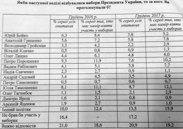 Если бы выборы президента Украины проходили в середине декабря 2017 года, лидерами гонки стали бы руководитель партии "Батьківщина" Юлия Тимошенко и действующий глава государства Петр Порошенко. Таковы результаты нового исследования, проведенного в конце 2017 года Фондом Демократические инициативы им. Кучерива совместно с социологической службой Центра Разумкова.